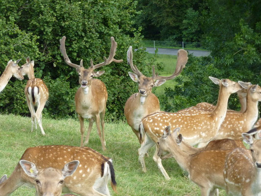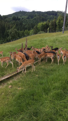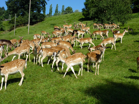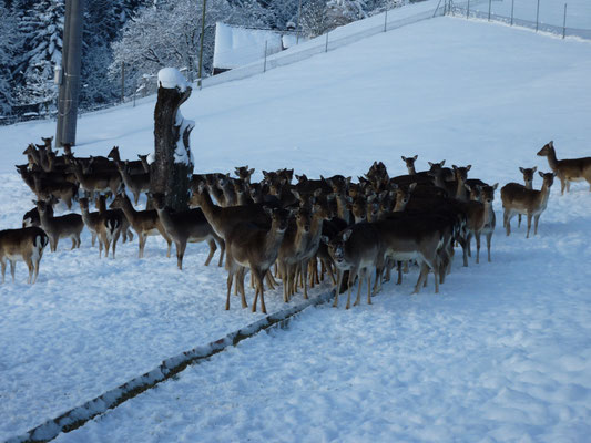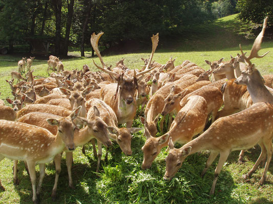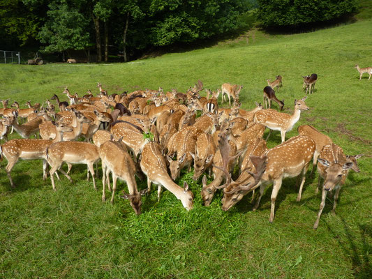 Unsere Damhirsche leben das ganze Jahr hindurch im Freien, sind genügsam, ernähren sich im Sommer von Weidegras und im Winter von Heu, Silogras und Futterrüben.
